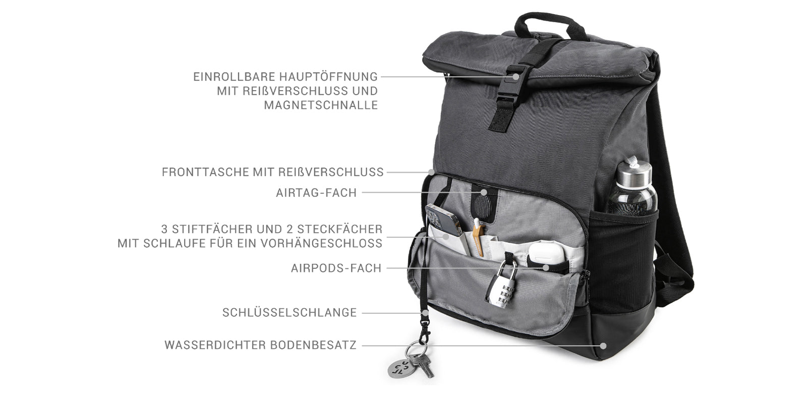 Unser Abstract Rolltop Rucksack ist die optimale Wahl für alle, die einen stilvollen und zugleich durchdachten, funktionalen Alltags-Begleiter suchen.